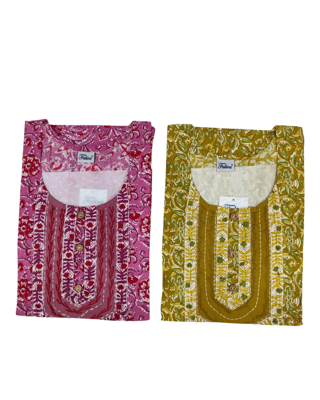 At the front, there is a contrasting printed yoke/placket panel starting from the neckline and ending in a V-shape at the bust.