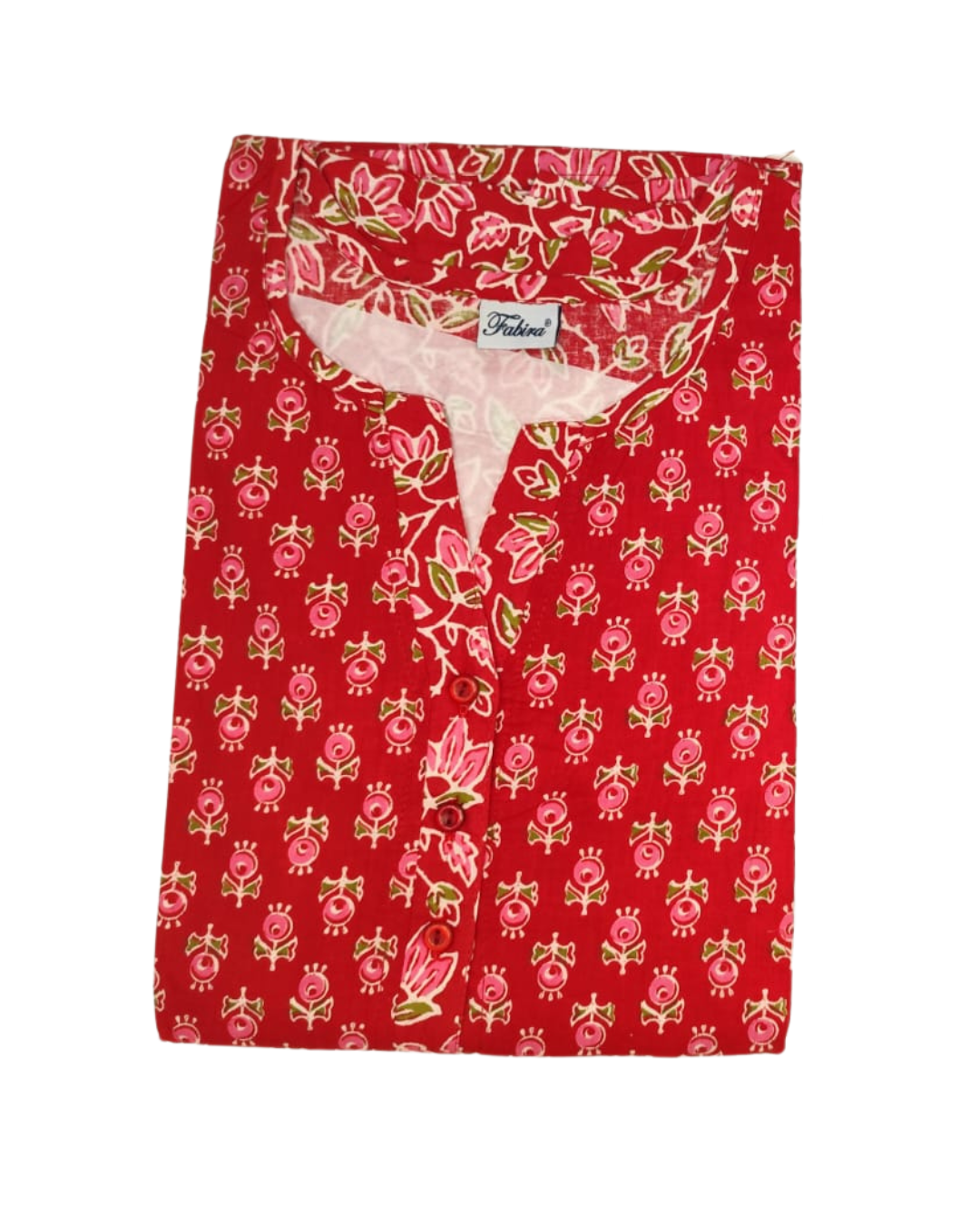 3. Neckline & Placket Detailing: The neckline is a round neck with a small V-slit. A short button placket (3–4 buttons) is present, framed with fabric piping in the same print, creating visual coherence.
