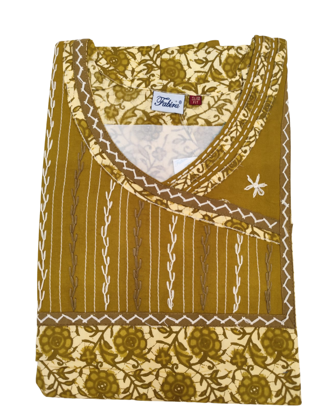 The gown has an Angrakha-style overlapping V-neckline, giving it a stylish, contemporary look. A small patch with katha embroidery on one side of the yoke, adds a delicate handcrafted touch.