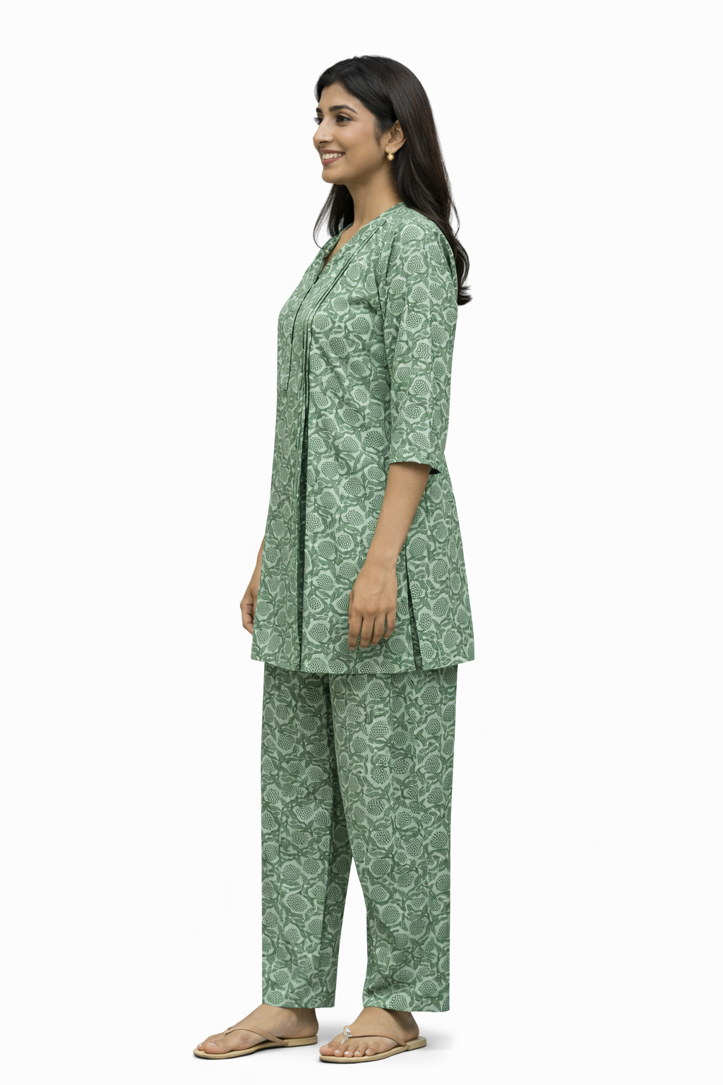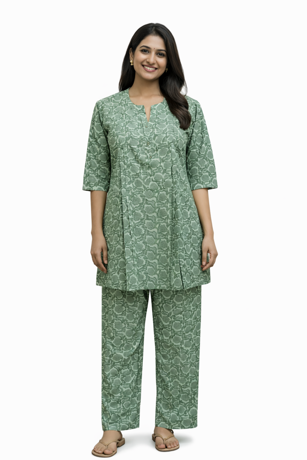 The pure cotton cord set showcases a dense, all-over floral foliage pattern inspired by traditional Indian block-print designs. The print is uniform, rhythmic, and highly cohesive, creating a refined yet understated look. The design leans toward a classic and artisanal aesthetic rather than a bold or contrasting one.