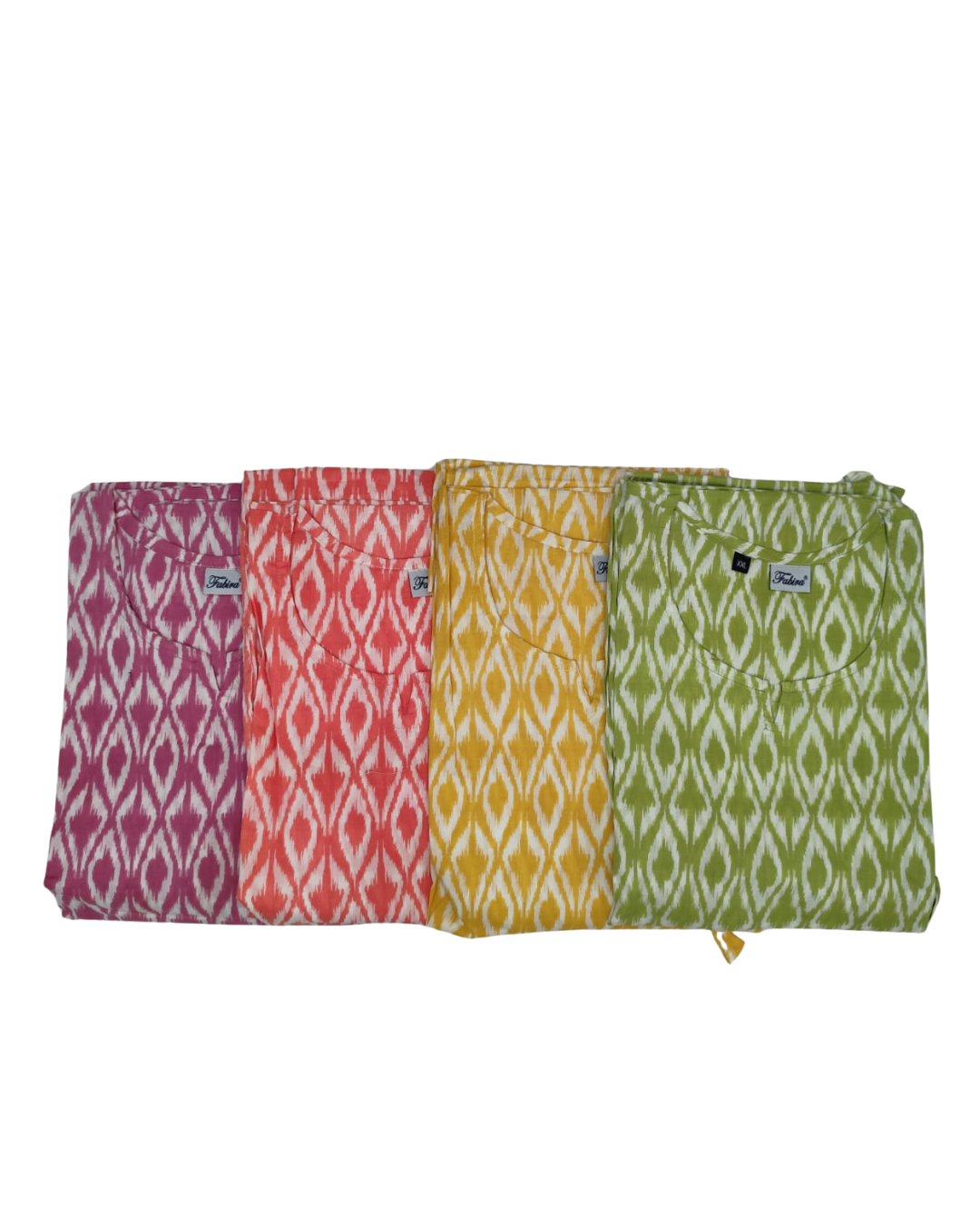 Featuring two-piece Ikkat printed pajama set with Kaftan Top and matching full-length pant with side pocket in pure cotton. Cotton material, perfect as a nightwear.