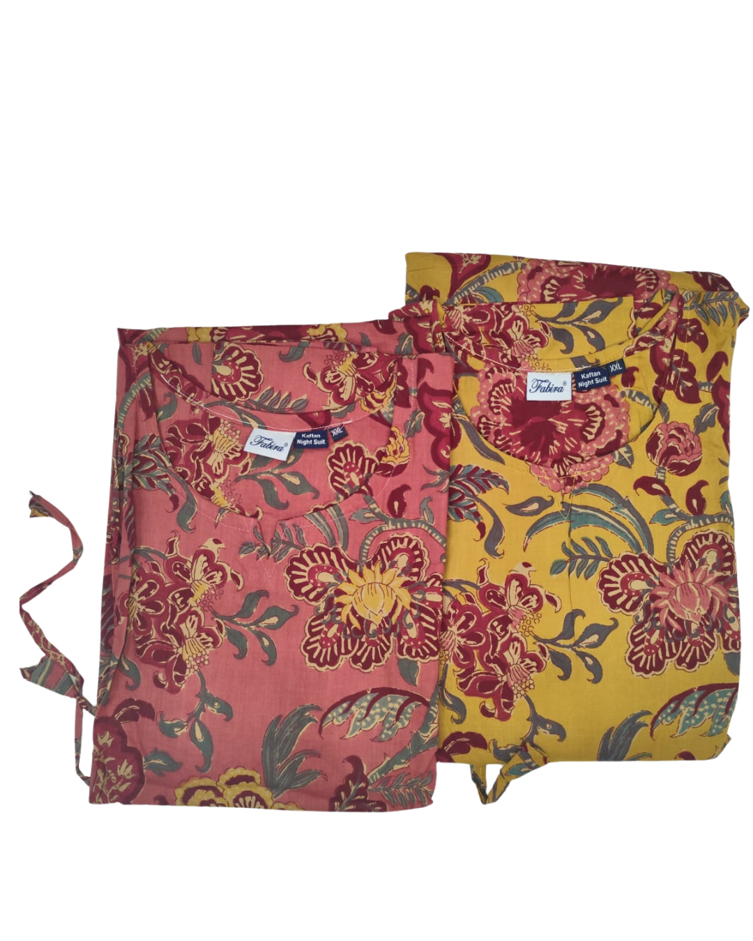 Featuring two-piece Floral printed pajama set with Kaftan Top and matching full-length pant with side pocket in pure cotton. Cotton material, perfect as a nightwear.