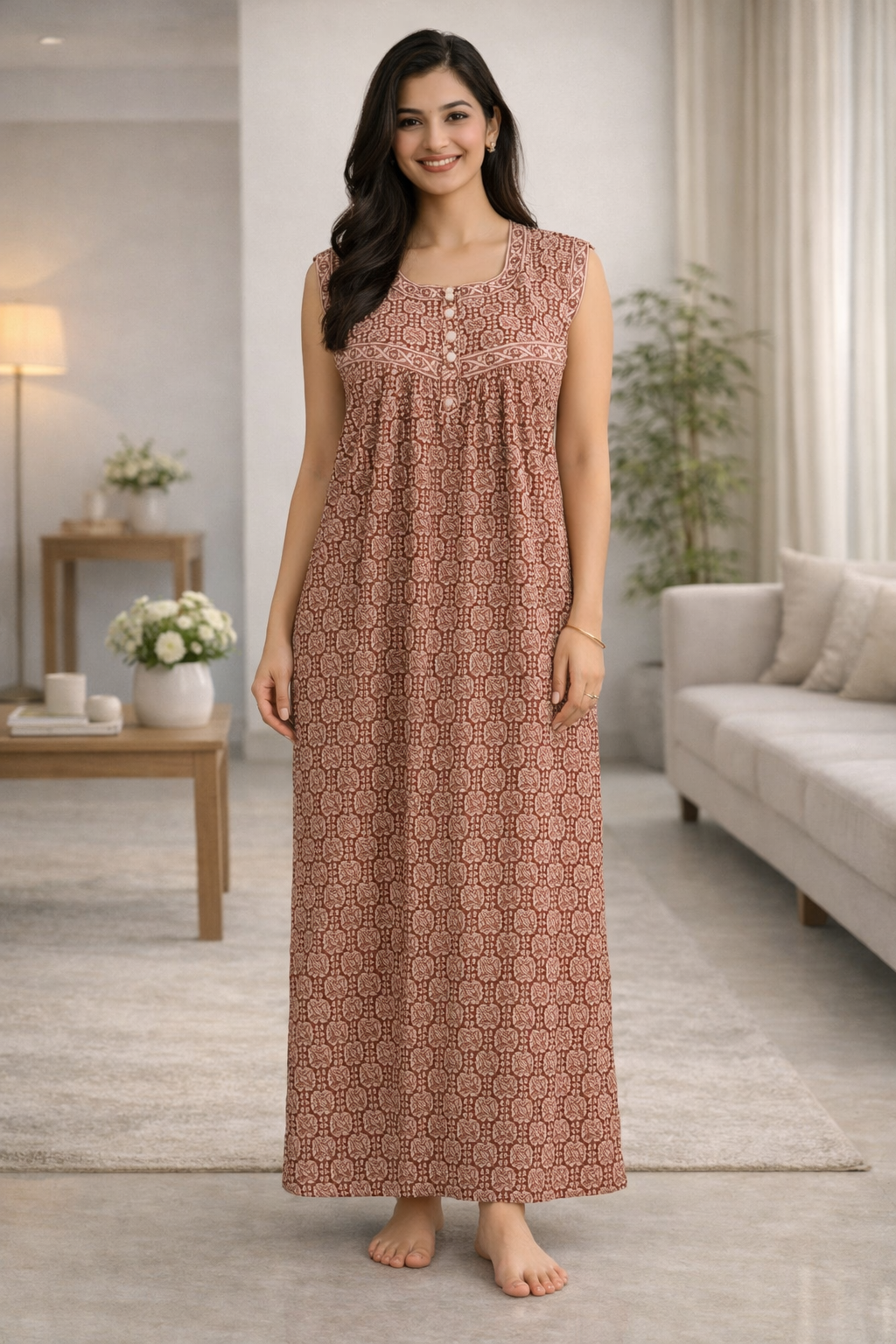 SLEEVELESS FULL LENGTH REGULAR - GEOMETRICAL BLOCK PRINT-BRICK BROWN - 406b